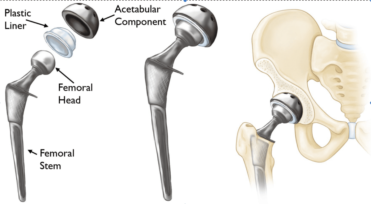Total hip replacement surgery involves removal of the diseased or damaged hip joint, and replacement with titanium and ceramic components. After this procedure patients will have restored movement and function of the joint (without stiffness), and will be able to walk or perform daily activities without debilitating pain.